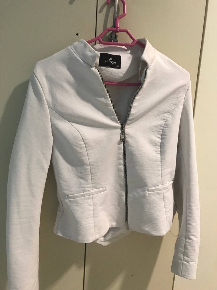 Fermuarlı, beyaz pamuklu, uzun kollu, normal boyda, dar kesim kadın blazer ceket. Trendy sokak stili için uygundur.