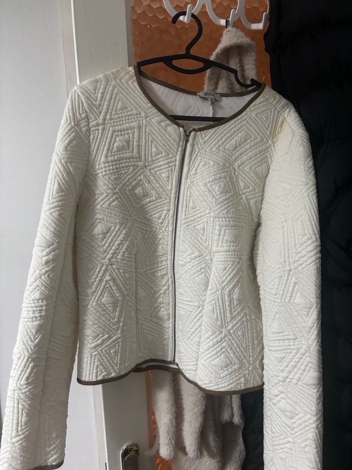 Bu beyaz, fermuarlı kadın ceketi, uzun kollu ve yuvarlak yakalıdır. Yumuşak sentetik kumaştan yapılmış olup, hafif geometrik dokuya sahiptir ve günlük kullanım için uygundur.
