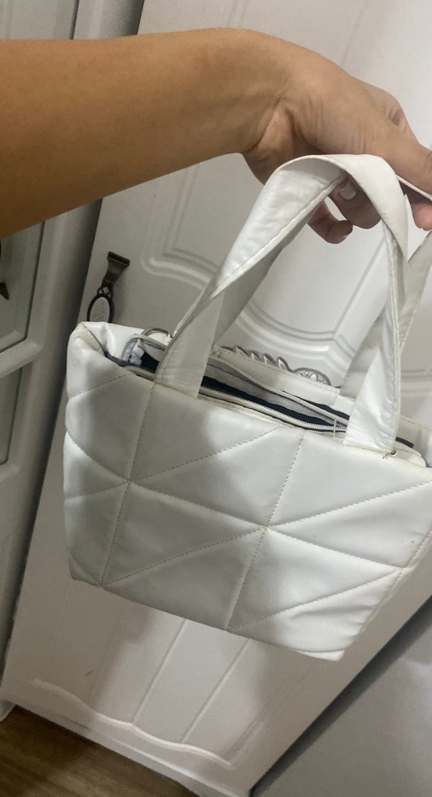 Beyaz renkte, fermuarlı kapamalı, yumuşak dokulu sentetik kumaştan kadın çantası. Düz ve minimalist tasarımlı, sokak stiline uygun.