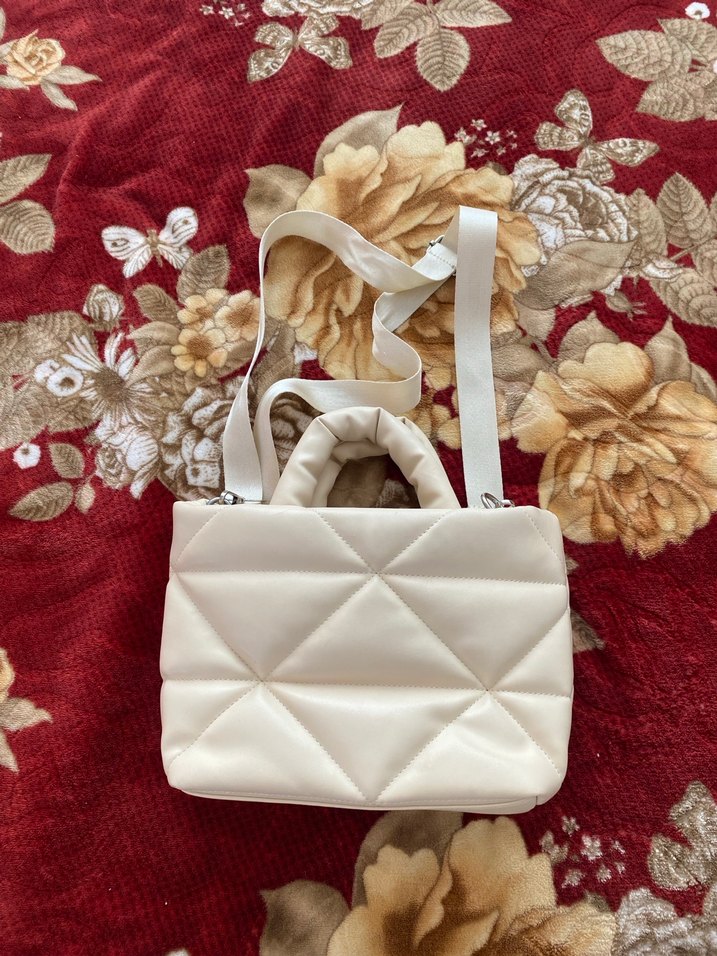 Beyaz renkli, fermuarlı kadın çantası, sentetik kumaştan yapılmıştır. Sokak modasına uygun, Paris tarzı günlük kullanıma uygundur. Bir kez kullanılmıştır