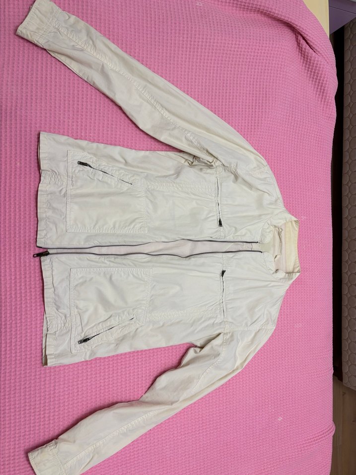 Beyaz, fermuarlı, uzun kollu ve normal midi uzunlukta kadın ceketi. Yakası kesik ve vücuda oturan kesimiyle rahat bir sokak stili sunar. Sentetik kumaştan üretilmiştir.
