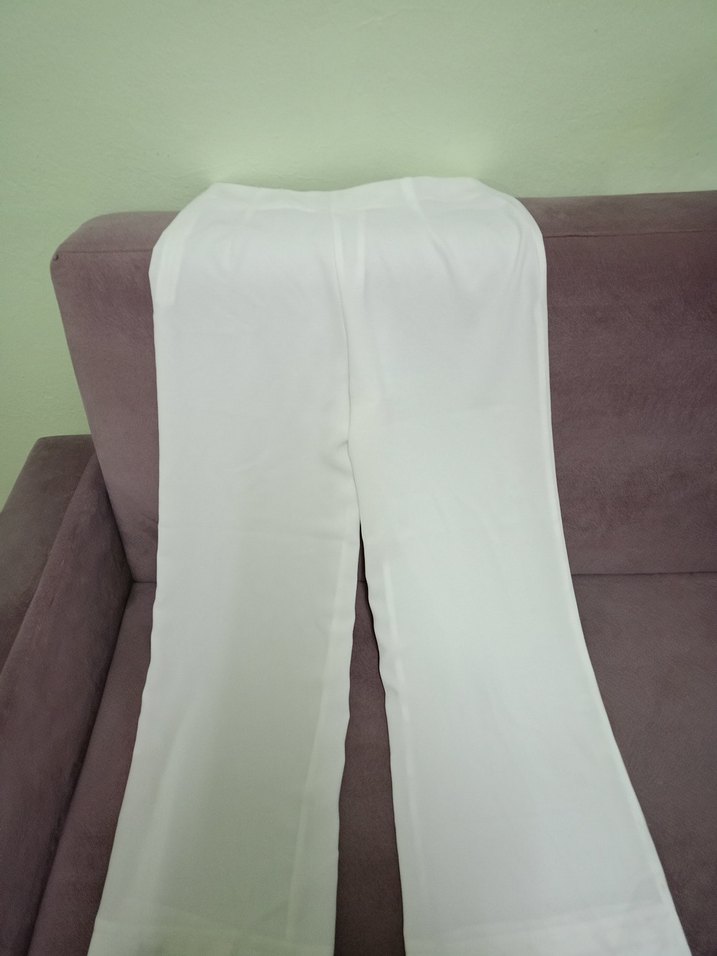 Beyaz kumaş pantolon, regular kesim ve midi boyda, Minimalist ve ofis tarzına uygundur. 1-2 kez giyilmiştir.