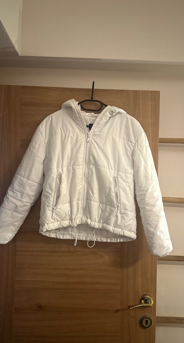 Fermuarlı önden kapanmalı, uzun kollu ve yüksek yakalı beyaz, fitted kesim mont. Yumuşak ve sıcak kumaştan, midi boyda, rahat tarzda bir parça.