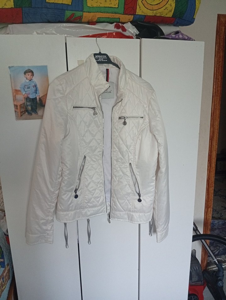 Beyaz, fermuarlı, kısa kesim kadın ceket. Sıkı oturan, suni kumaştan, düz desensiz, bisiklet yaka ve askılı kollu tasarım, günlük sokak stili için uygun.