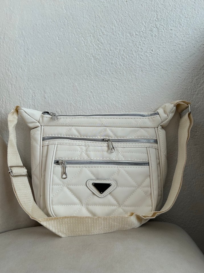Beyaz renkte, fermuarlı ceplere sahip kadın omuz çantası. Ayarlanabilir askılı, sentetik kumaştan yapılmıştır ve günlük sokak stiline uygundur.