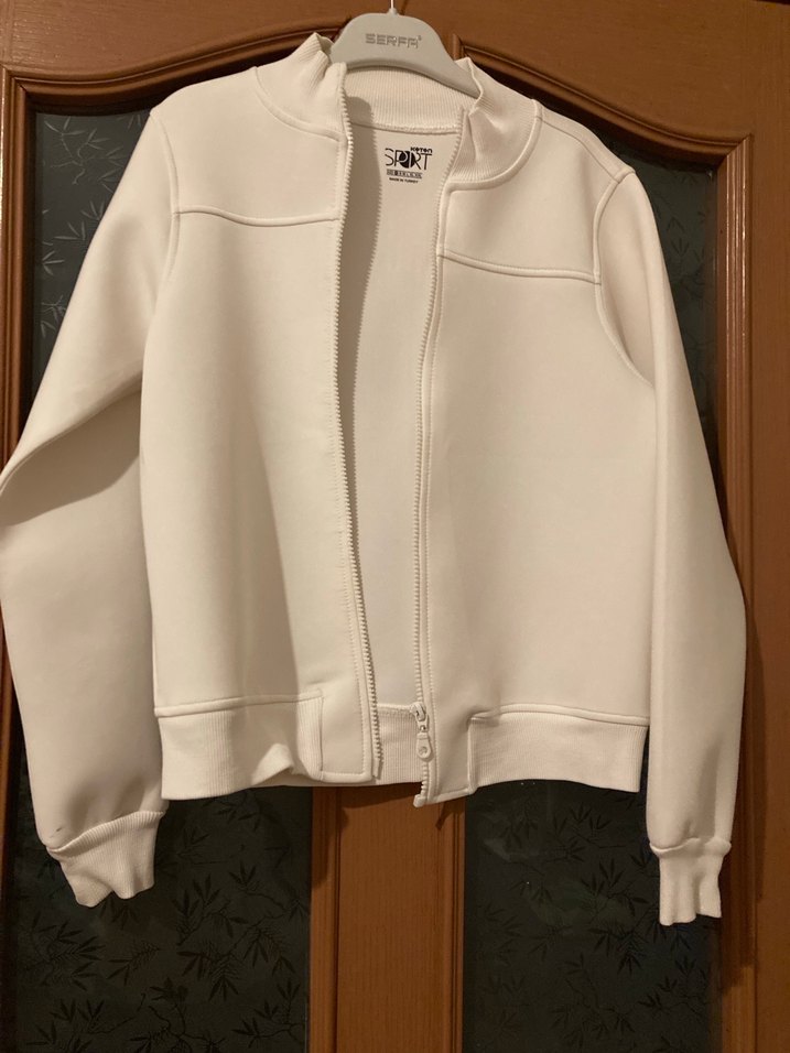 Uzun kollu, bisiklet yaka ve fermuarlı beyaz kadın ceket. Yumuşak ve sıcak kumaştan, midi boyda ve günlük spor tarzı için uygun.