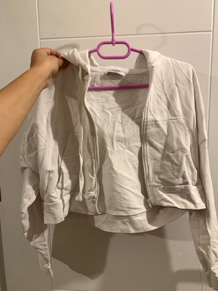 Beyaz renkli, fermuarlı, uzun kollu ve bisiklet yaka kadın sweatshirtü. Hafif keten kumaştan, minimal ve sokak tarzında, günlük kullanıma uygun.