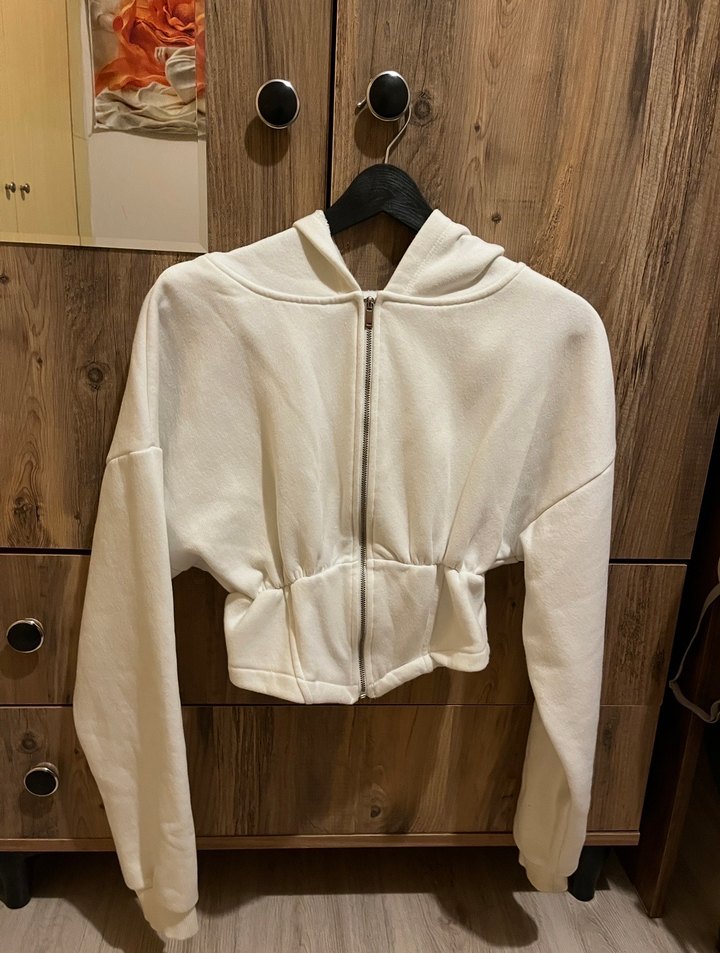 Fermuarlı, uzun kollu, beyaz kadın sweatshirtü. Yumuşak ve sıcak kumaştan, normal boyda, sade tasarımlı, günlük kullanım için uygun. S-M bedene uyumludur