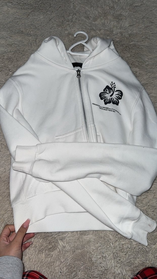 Beyaz fermuarlı sweatshirt, uzun kollu ve yüksek yakalıdır. Kelebek baskılı, dar kesim, yumuşak ve sıcak kumaştan üretilmiştir. Rahat sokak stiline uygundur.