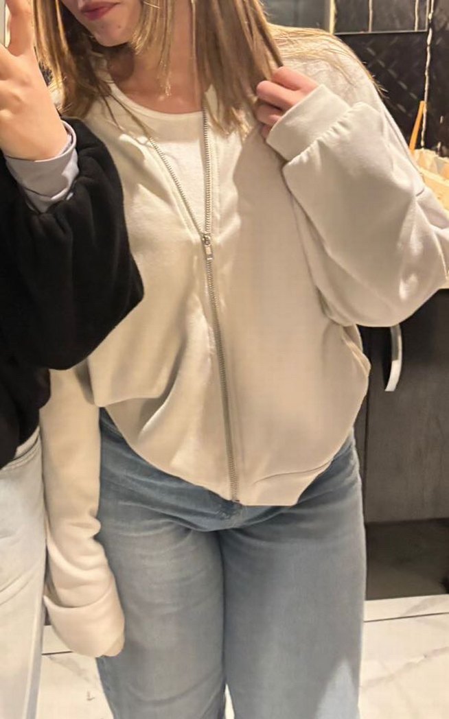 Beyaz, fermuarlı ve yuvarlak yakalı kadın sweatshirt. Rahat kesimi ve uzun kollarıyla günlük kullanıma uygun, yumuşak sentetik kumaştan.