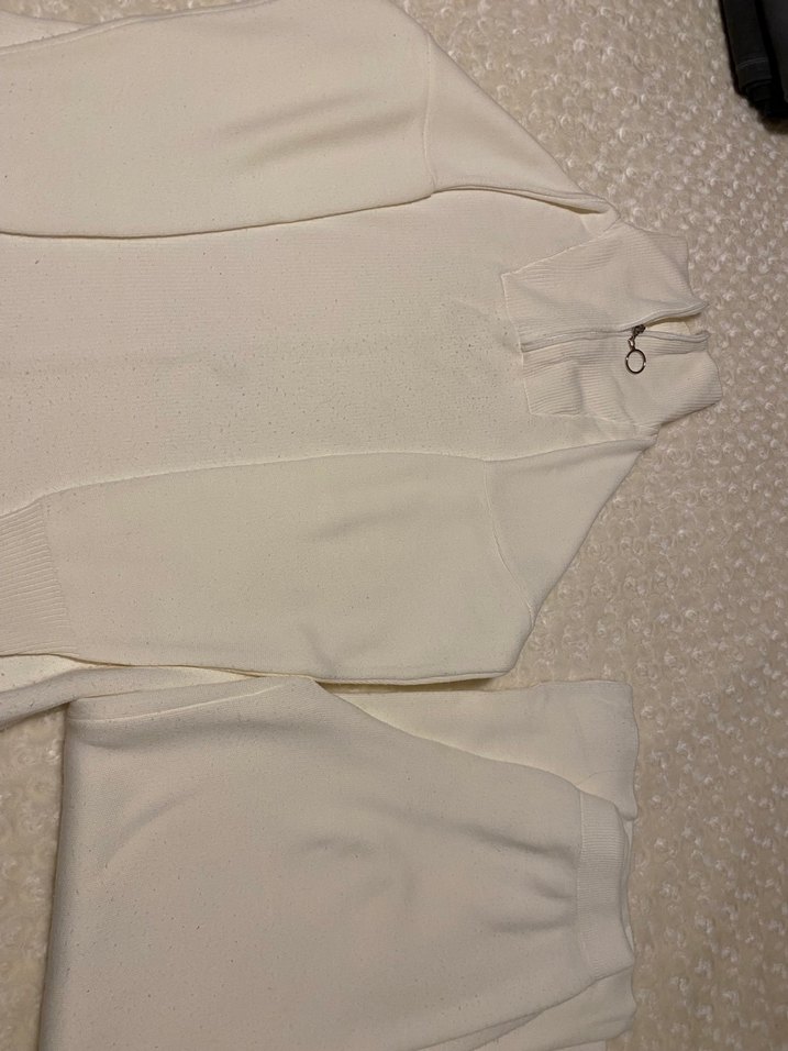 Beyaz, fermuarlı, yüksek yakalı ve uzun kollu kadıntrıko takım . Yumuşak sentetik kumaştan yapılmış, midi boyda, dış mekan kullanımı için uygun.