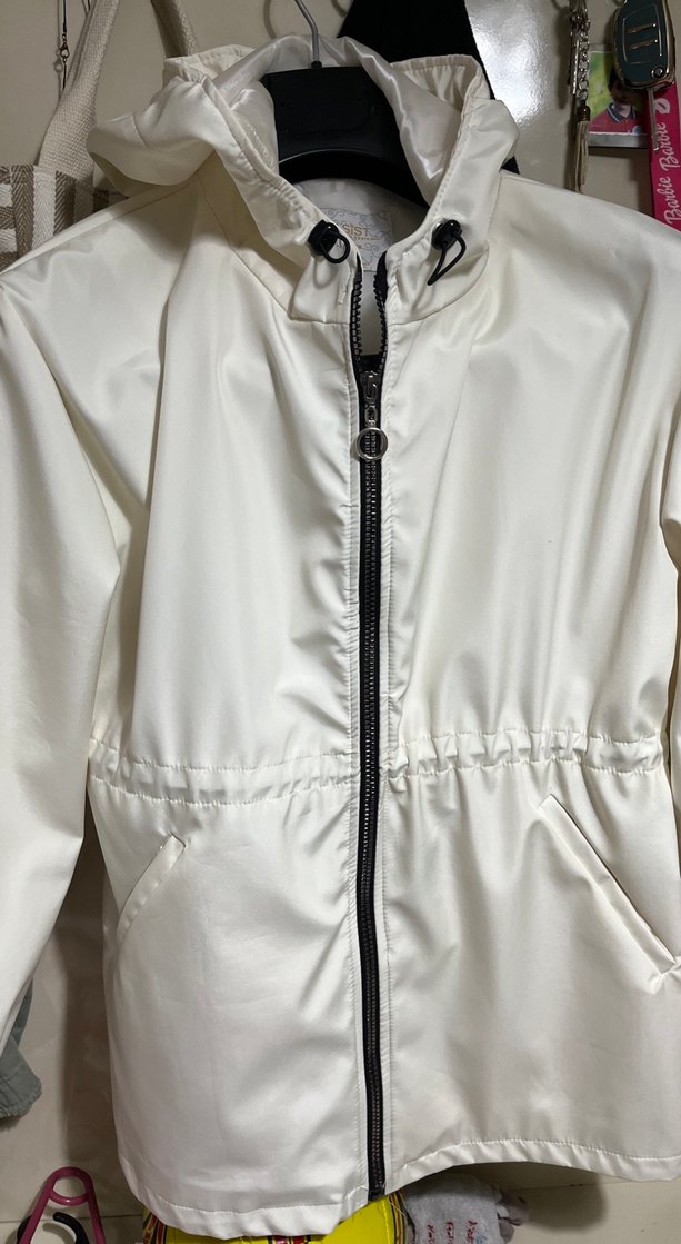 Beyaz renkli, yüksek yakalı ve fermuarlı kadın yağmurluğudur. Sentetik kumaştan, normal uzunlukta ve fitted kesimdedir. Sokak modası ve athleisure tarzına uygundur. Parlak yüzeyli, askılı kolları vardır. ☔