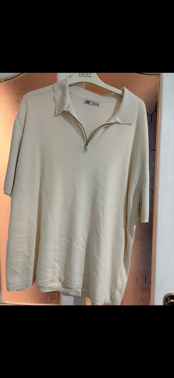 Beyaz renkli, fermuarlı yakaya sahip keten erkek polo tişört. Kısa kollu, bol kesim ve normal boyda, günlük rahat sokak stili için uygundur. EKULL markalı.