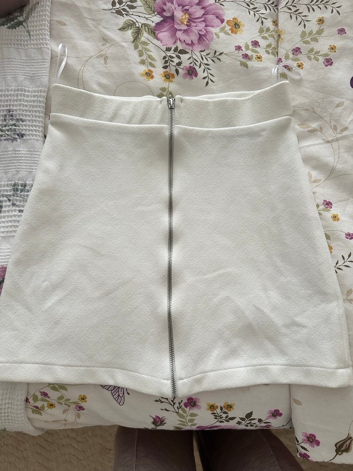 Düz beyaz, ön fermuarlı, sentetik kumaştan yapılmış, dar kesim mini etek. Sokak modasına uygun, günlük kullanıma ideal.