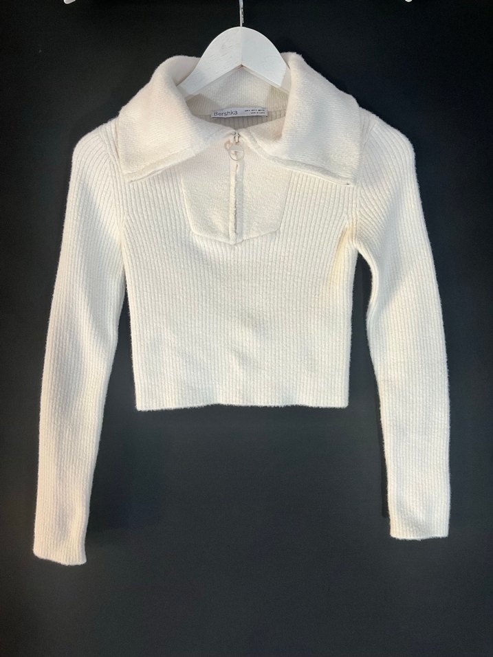 Beyaz renkte, örgü kumaştan yapılmış, yarım fermuarlı yüksek yakalı, uzun kollu ve normal boyda dar kesim bir kazak. Sade tasarımıyla gündelik sokak modasına uygundur. ❄️