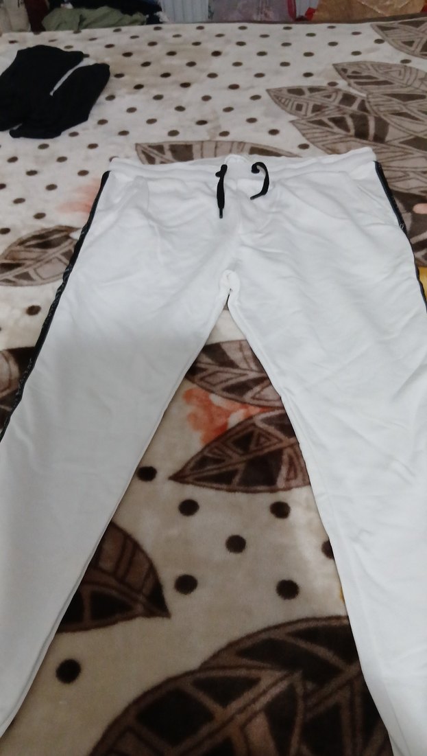 Sentetik kumaştan beyaz, fermuarlı cepli, siyah yan şeritli rahat kesim erkek eşofman Günlük kullanım ve sokak stili için uygundur.