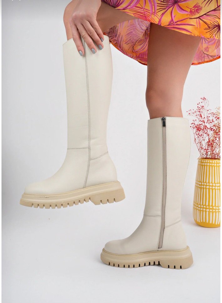 Beyaz, fermuarlı, stiletto topuklu diz boyu kadın çizme. Kauçuk malzemeden, pastel renkte ve desensiz, günlük sokak stili için uygun.
