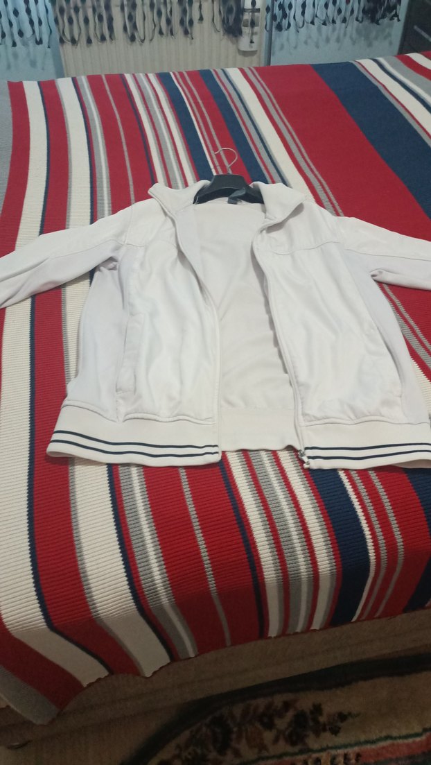 Yüksek yakalı ve fermuarlı beyaz kadın ceketi. Uzun kollu, rahat kesimli ve günlük kullanım için uygun, yumuşak ve sıcak bir kumaşa sahip.