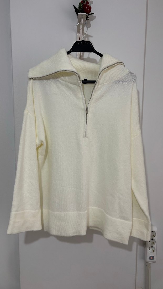 Beyaz renkli, fermuarlı yarım balıkçı yaka, uzun kollu, bol kesim kadın kazak. Yumuşak ve sıcak kumaştan, gündelik kullanıma uygun sade tasarım.