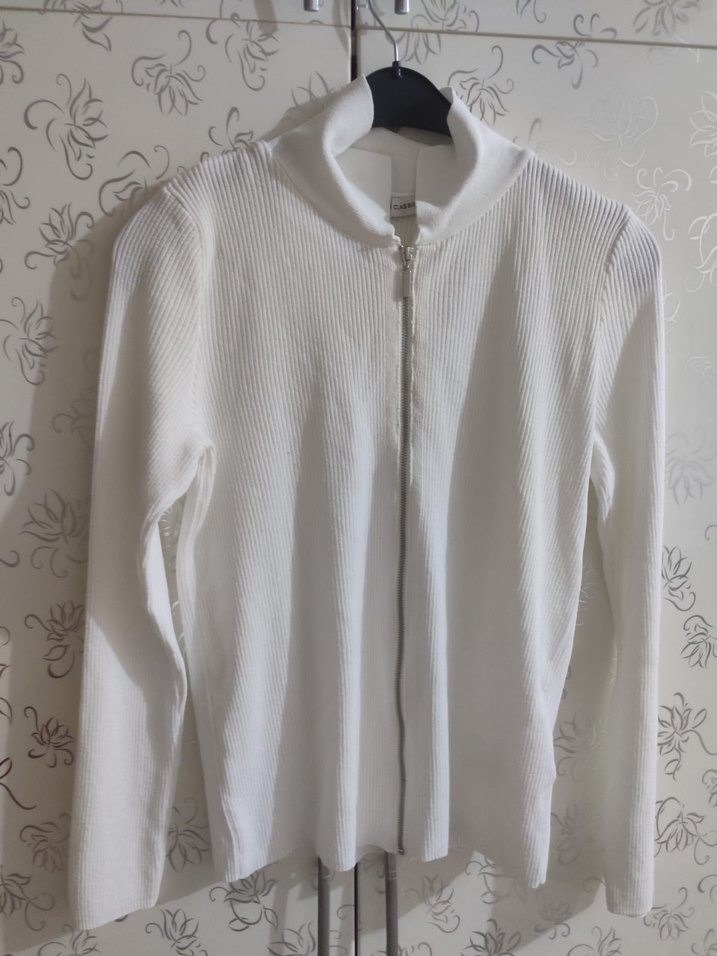 Beyaz renkli, fermuarlı yarım balıkçı yaka, uzun kollu ve pamuklu kumaştan rahat kesime sahip kadın kazak. Günlük sokak stili için uygundur.