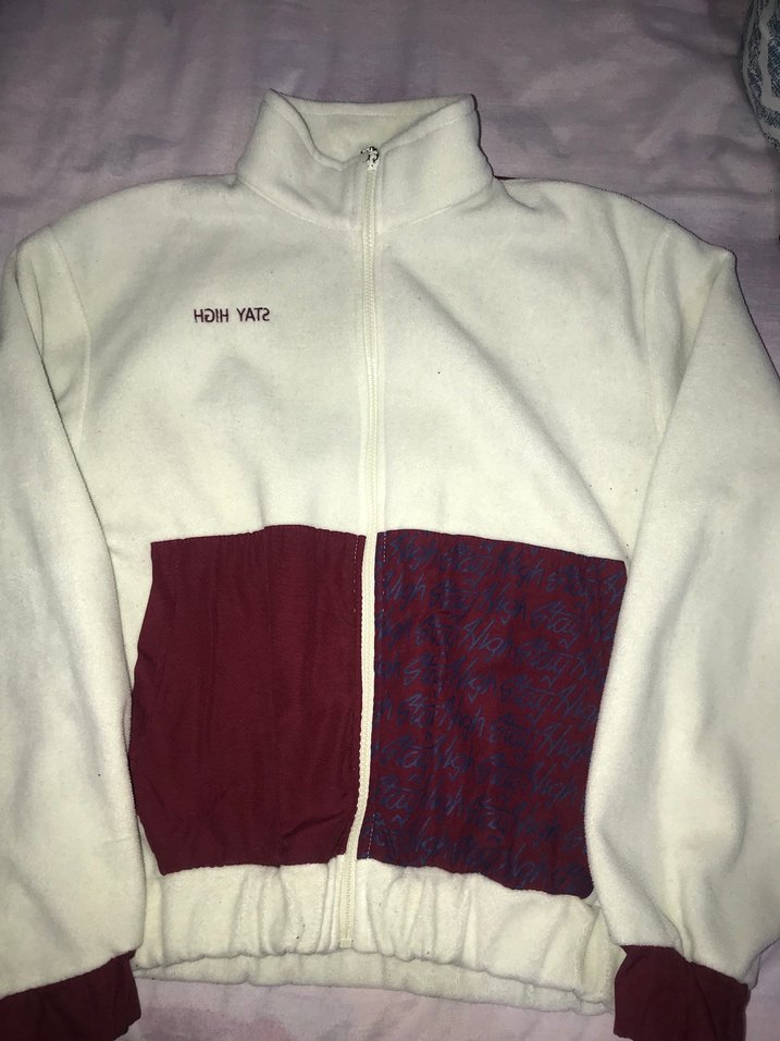 Beyaz, yüksek yakalı ve fermuarlı kadın ceketi. Uzun kollu, bol kesim ve konforlu yumuşak kumaş. Önünde bordo detay bulunur. Günlük rahat stil için uygundur.