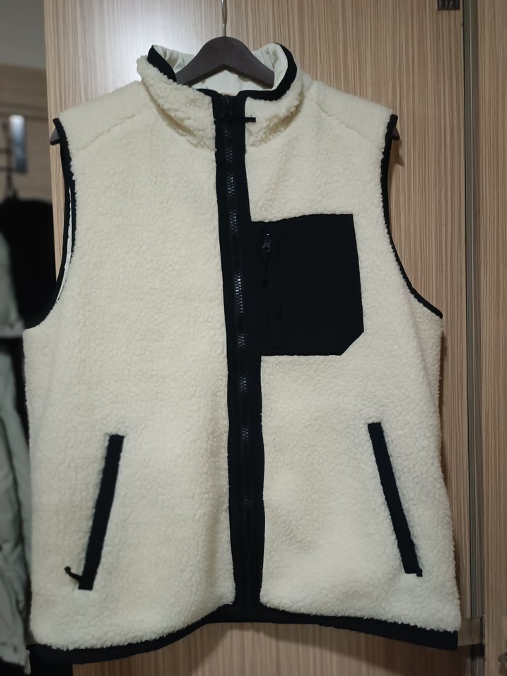 Herkes için yüksek yakalı, fermuarlı cepli, yumuşak dokulu beyaz yelek. Koyu detaylar şık bir kontrast sağlar. Günlük rahat kombinler için uygundur.