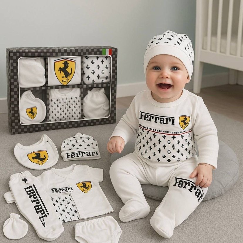 Uzun kollu, beyaz renkli Ferrari baskılı erkek bebek tulumu, yumuşak pamuk kumaştan örülmüş ve bisiklet yaka tasarıma sahip. Rahat ve şık bir sokak giyimi ürünü. ️