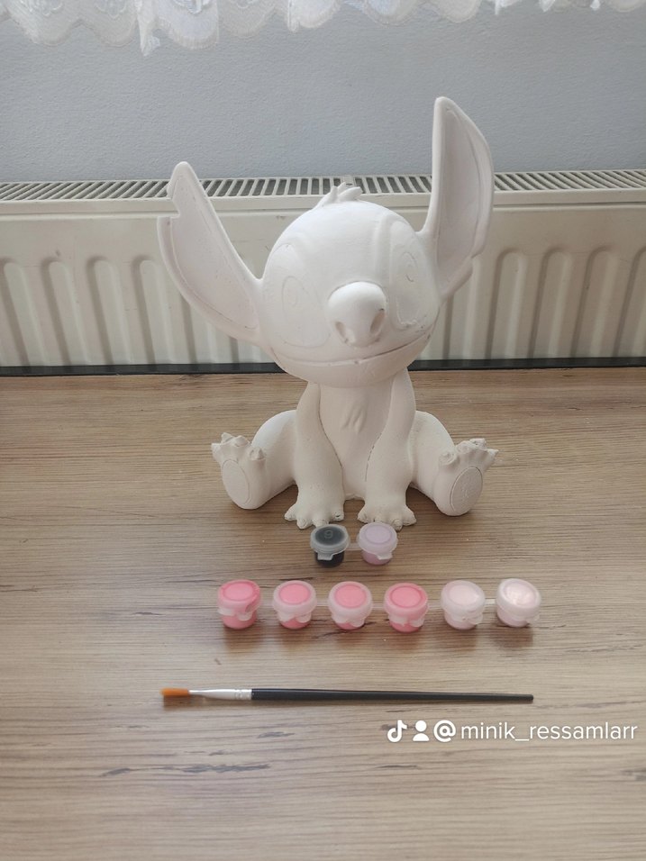 Beyaz figürin, boyama için fırça ve çeşitli renklerde boyalarla birlikte gelir. Sevimli bir karakter tasarımına sahiptir.