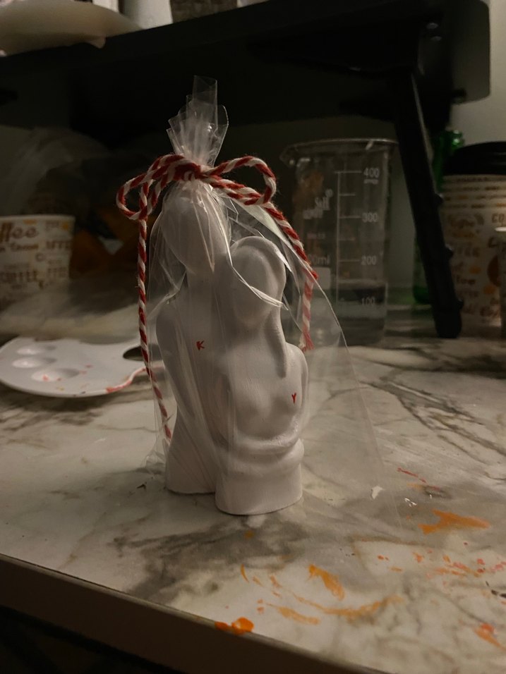 Kırmızı beyaz ip ile bağlanmış, hafif beyaz renkte iki figürin seti. Düzgün yüzeyli ve sade tasarımlı. Göğüste baş harfli