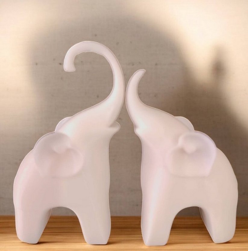 Beyaz renkte, modern ve yumuşak hatlara sahip fil figürleri. Her biri yukarı kalkık hortumlu, mekâna şıklık katar .