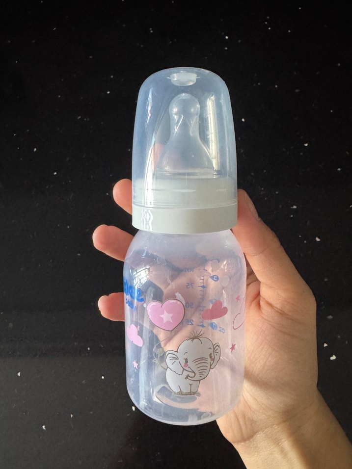 Beyaz renkli bebek biberonunda pastel tonlarda fil ve kalp desenleri yer alır. Yumuşak emzik ve koruyucu kapak mevcuttur.