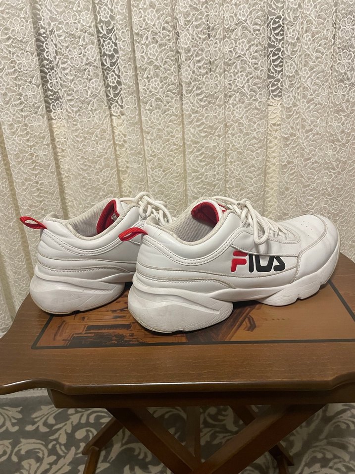 Beyaz Fila platform topuklu spor ayakkabı, kauçuk tabanlı, kırmızı detaylı. Spor ve rahat günlük kullanıma uygun.
