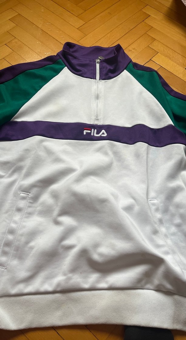 FILA markalı beyaz sweatshirt, yarım fermuarlı yuvarlak yakalı ve uzun kolludur. Gevşek kesimi ve pastel yeşil-mor baskılı detaylarıyla spor ve rahat kullanıma uygundur. Boyu 68 cm kolaltı 54 cm ♂️
