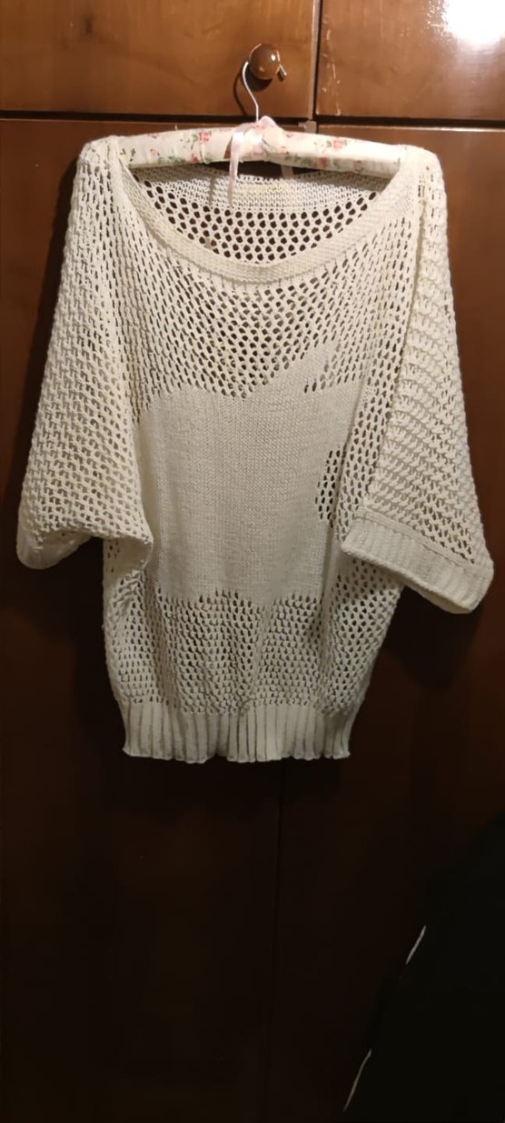 Etiketsizdir, az kullanılmıştır. Beyaz renk file triko modeldir. Ön kısmında örgü motif detayı bulunmaktadır. Salaş ve dökümlü kesime sahiptir, yarasa kol formundadır.