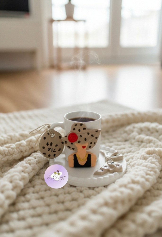 Gri şapka ve kırmızı çiçek detaylı figürlü beyaz seramik fincan ve tabak seti, sıcak içecekler için uygundur. ☕