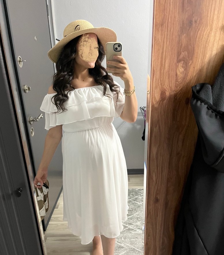 Beyaz midi hamile elbisesi, kısa kollu ve fırfırlı detaylara sahiptir. Rahat kesimi ve straplez yakasıyla bohem tarzda gündelik kullanıma uygundur. Elbiseyi sadede hamile çekimimde kullandım.