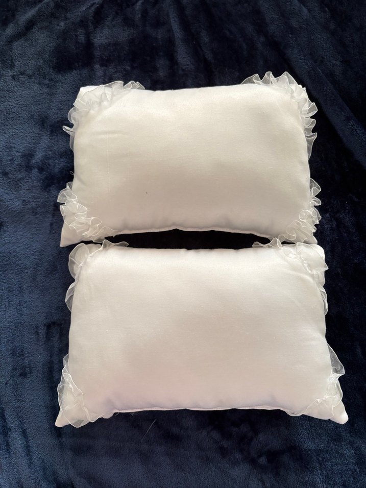 Yumuşak kumaştan, kenarları fırfırlı beyaz dekoratif iki adet yastık seti. Konfor ve şıklık sağlar. ️ Hiç kullanılmadı
