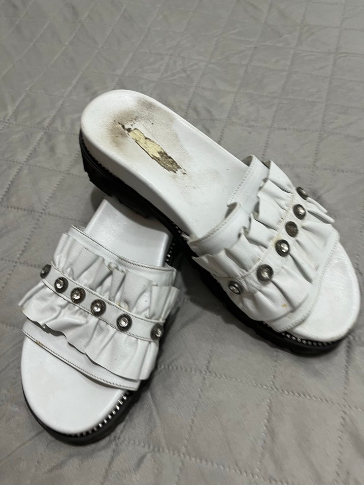 Beyaz, fırfırlı ve metal detaylı dolgu topuk terlikler. Parlak görünümlü kauçuk malzemeden yapılmıştır, günlük kullanım için uygundur.