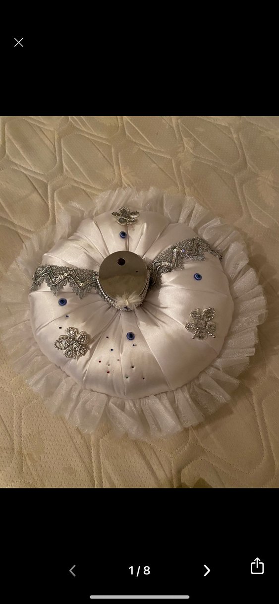Beyaz fırfırlı ve gümüş süslemeli, klasik tarzda avant-garde dokunuşlar taşıyan düğün aksesuarı. SÜNNET YASTIĞIDIR 10 YIL ONCE BIR KERE KULLANILDI SAĞLAM