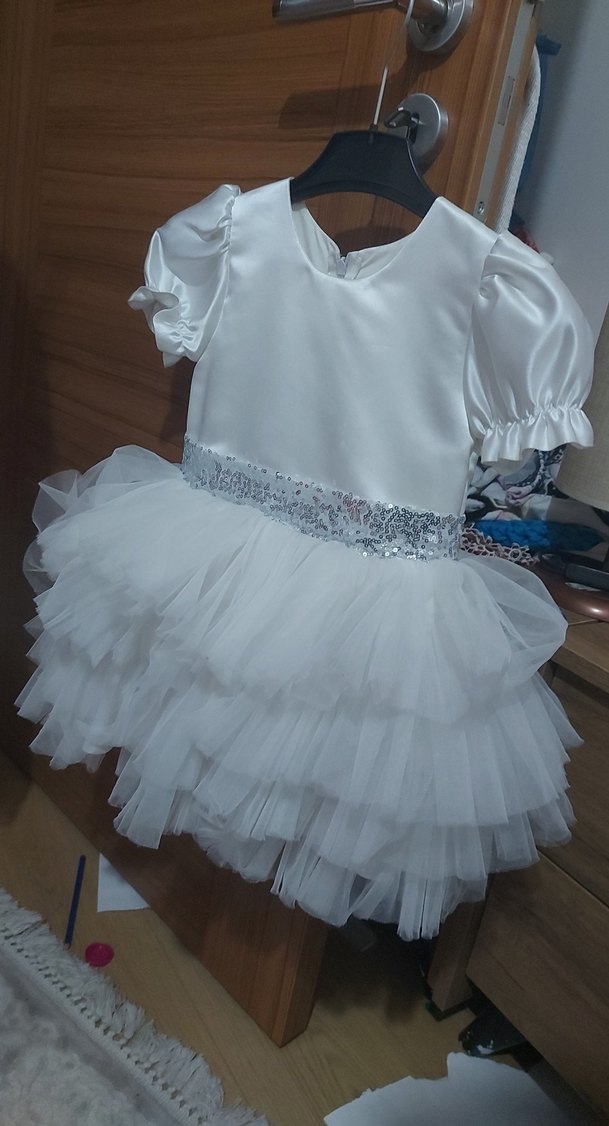 Beyaz kız çocuk elbise, şişkin kollu ve kat kat fırfırlı etekli. Bel kısmında parlak payet detayları bulunur, sentetik kumaştan üretilmiştir. ✨tokasida var