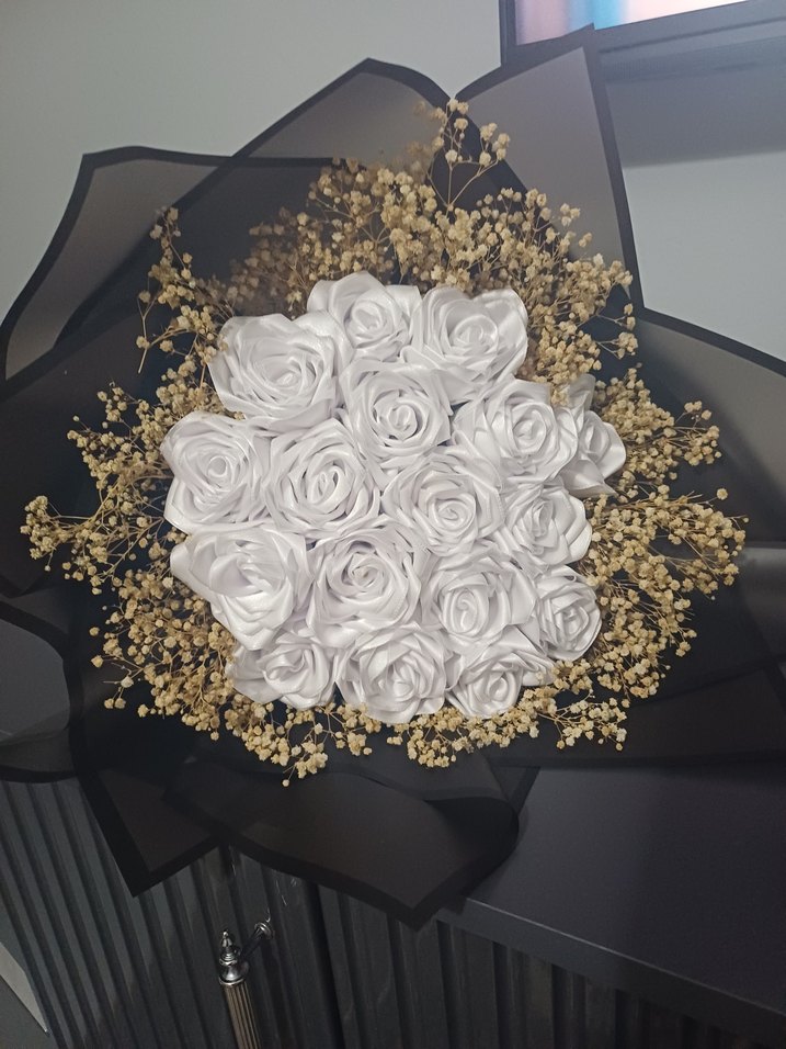 Beyaz fırfırlı gelin buketi, etrafı ince kurutulmuş çiçeklerle çevrili, klasik zarafeti yansıtan bohem ve ışıltılı tarzda. fiyat 1000