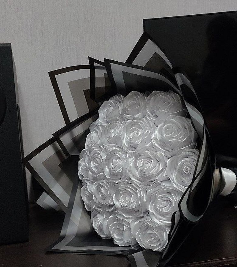 Gri ve siyah şeffaf kağıda sarılı, fırfırlı detaylara sahip beyaz gelin buketi, çağdaş ve avangart tarzda.