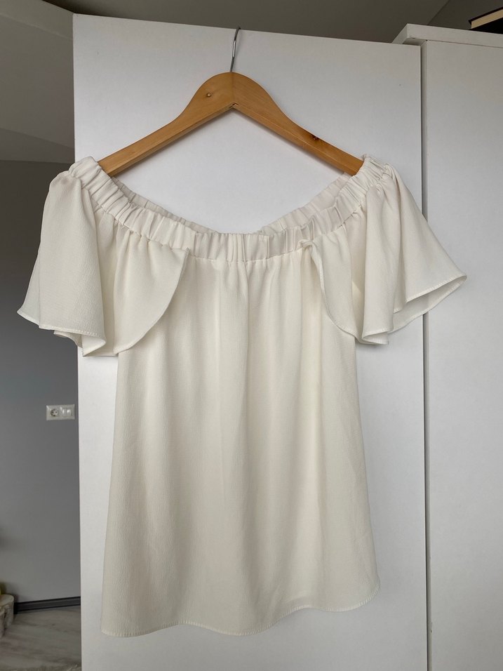 Beyaz fırfırlı yaka detaylı, kısa kollu,bol kesim ve midi boyda kadın bluz. Minimalist, desensiz ve günlük kullanıma uygun.