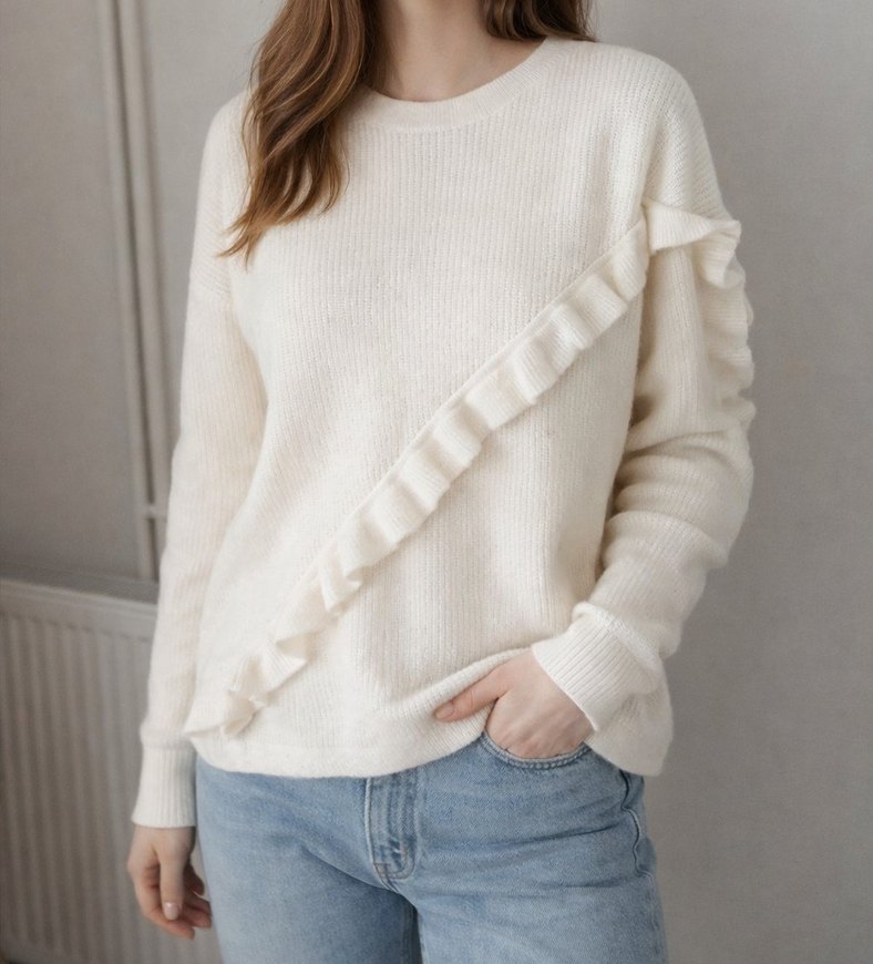 Beyaz renkli, kruvaze yaka ve uzun kollu triko kazak, gevşek kesim ve çapraz fırfır detayıyla rahat sokak stili için uygundur.