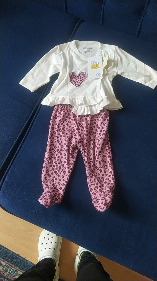 Beyaz dantelli uzun kollu üst, kalp baskısıyla süslenmiş, renkli desenli pembe pantolonla tamamlanmıştır. alt üst takım sıfır ürün etiketi üzerinde e bebek mağazasınin hello baby ürünü