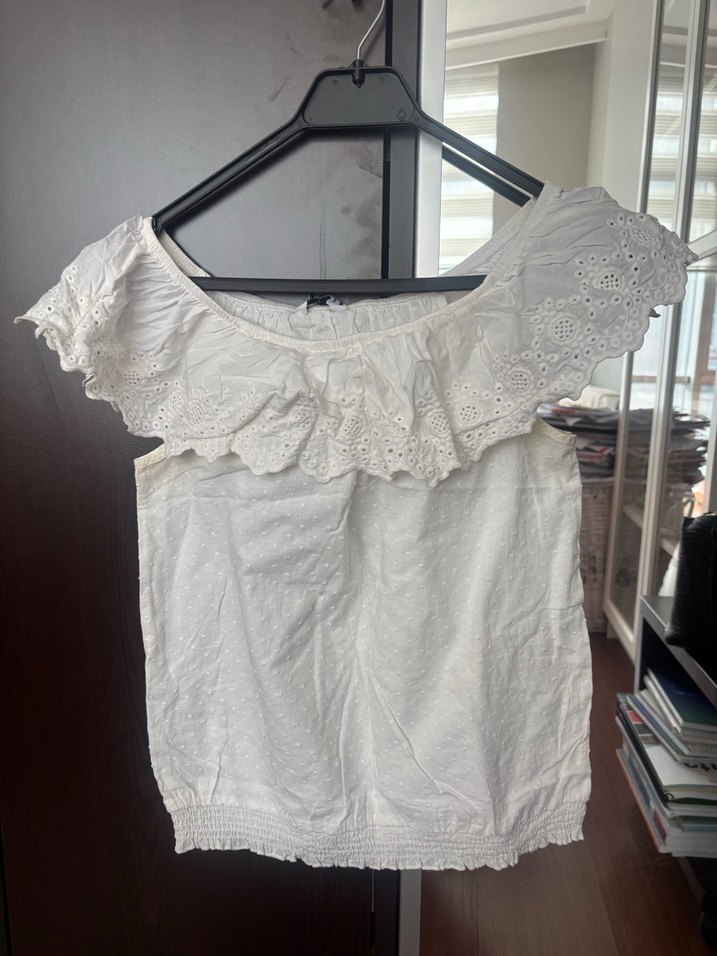 Beyaz keten bluz, straplez kısa kollu, nakışlı fırfır detaylı ve bol kesimdir. Mini boyda, bohem tarzda günlük kullanıma uygundur.