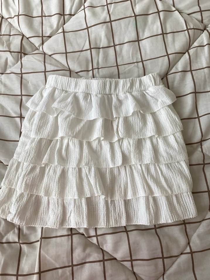 Beyaz keten midi etek, çok katlı fırfır detayları ve bol kesimiyle hafif, bohem tarz sunar. Günlük kullanım için uygundur.