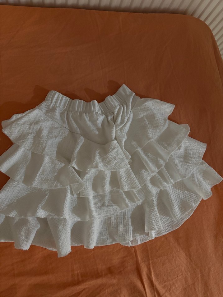 Beyaz keten mini etek, bol kesim ve kat kat fırfırlarla bohem ve Paris tarzını yansıtıyor. Günlük kullanıma uygun.