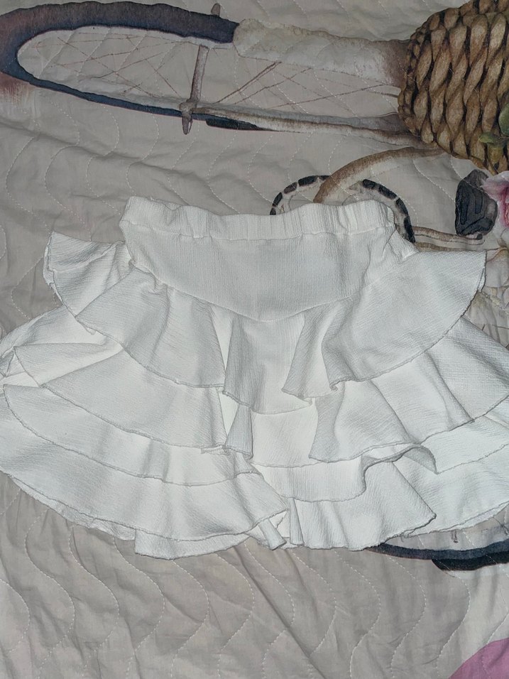 Beyaz keten mini etek, bol kesim ve kat kat fırfır detaylarıyla şık bir sokak stili sunar. Açık renk ve desensiz tasarımı günlük kullanım için uygundur.