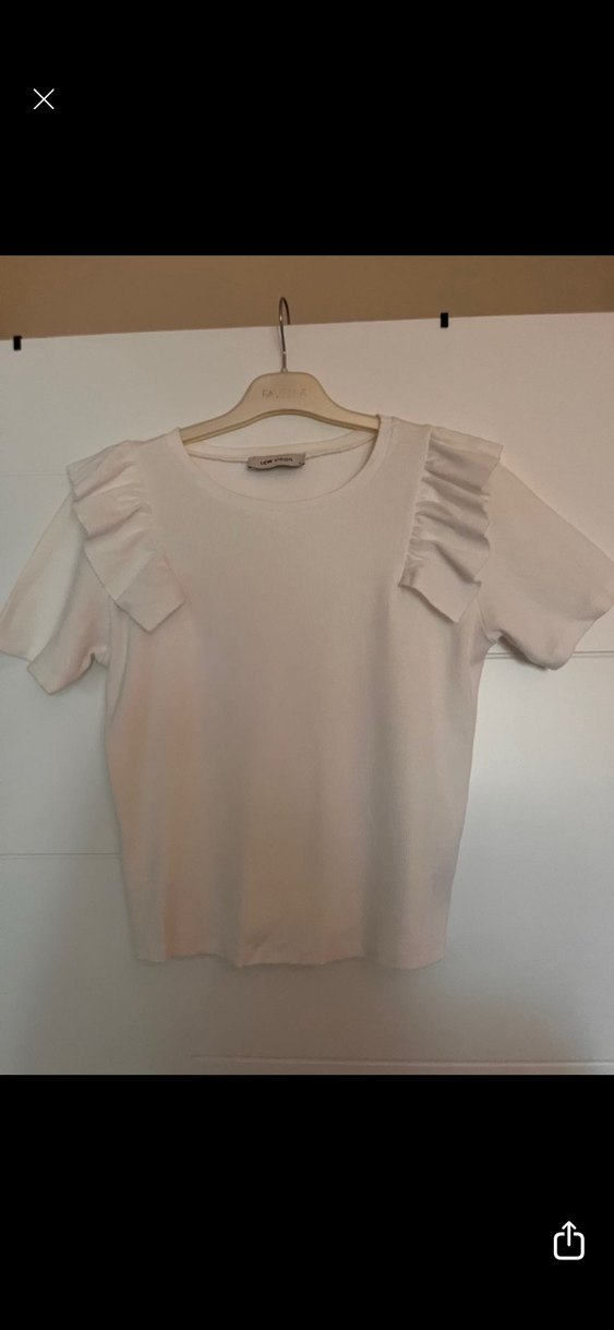 Keten kumaştan yapılmış, kısa kollu, fırfırlı omuz detaylarına sahip, yuvarlak yakalı beyaz Pastel renklerde baskı içerir.